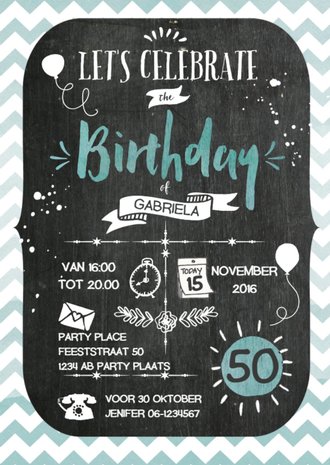 Originele uitnodiging verjaardag 50 jaar confetti. Upload je eigen foto en ontwerp je eigen verjaardag uitnodiging. Multicolor fotokaart in krijtbordmotief. Hippe uitnodiging voor een verjaardagsfeest.