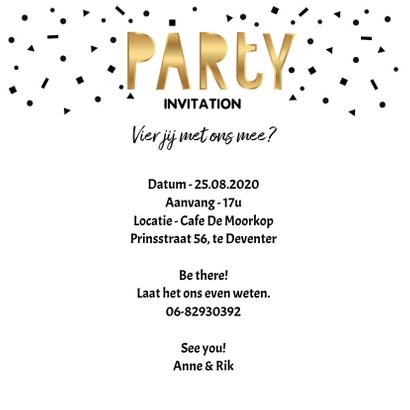 We hebben verschillende collecties gemaakt voor bijvoorbeeld je verjaardag een kinderfeestje uitnodiging jubileum zoals 5 jaar getrouwd en communie vormsel of doop. Zelf je foto uitnodiging maken. Met feestelijke confetti en twee foto s.