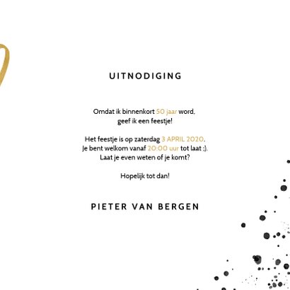 Stijlvolle verjaardagsuitnodiging met de leeftijd in goudlook. De leuke typografie en zwarte stippen zijn helemaal van nu. Uitnodigingen verjaardag verstuur je ongeveer 4 tot 6 weken van te. De kaart zal ook uw naam en thuisadres tonen en zal waarschijnlijk zeggen dat u hierbij wordt uitgenodigd voor een verjaardagsfeest van de persoon die u de kaart op een bepaalde datum en op een bepaalde locatie heeft gegeven.